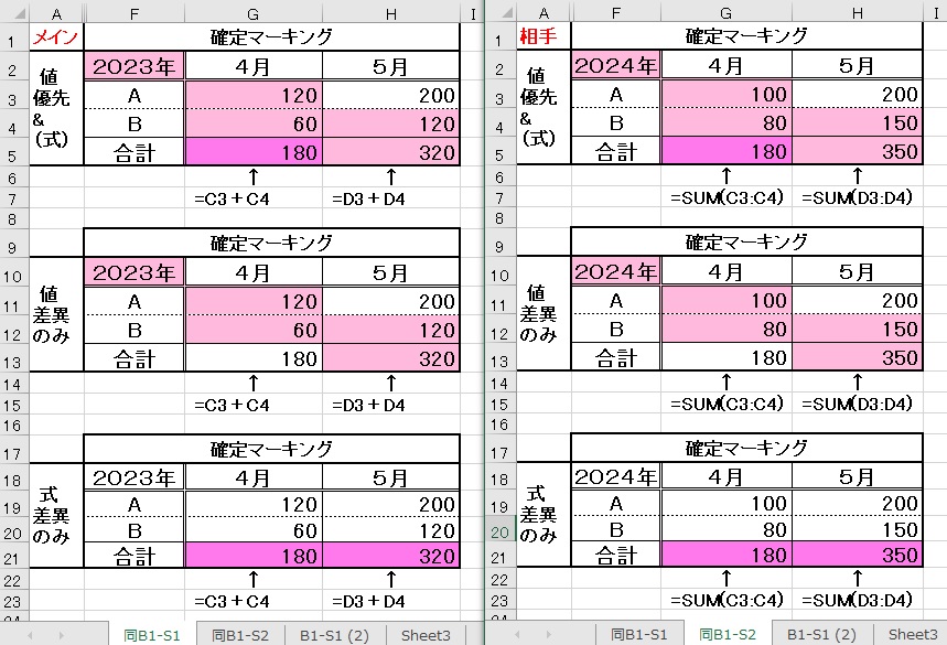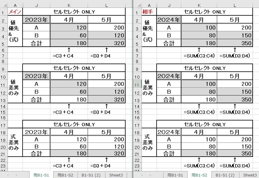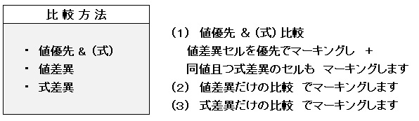 [注意] シートが保護されている場合には 全て[値](数式セルも結果値)で比較します