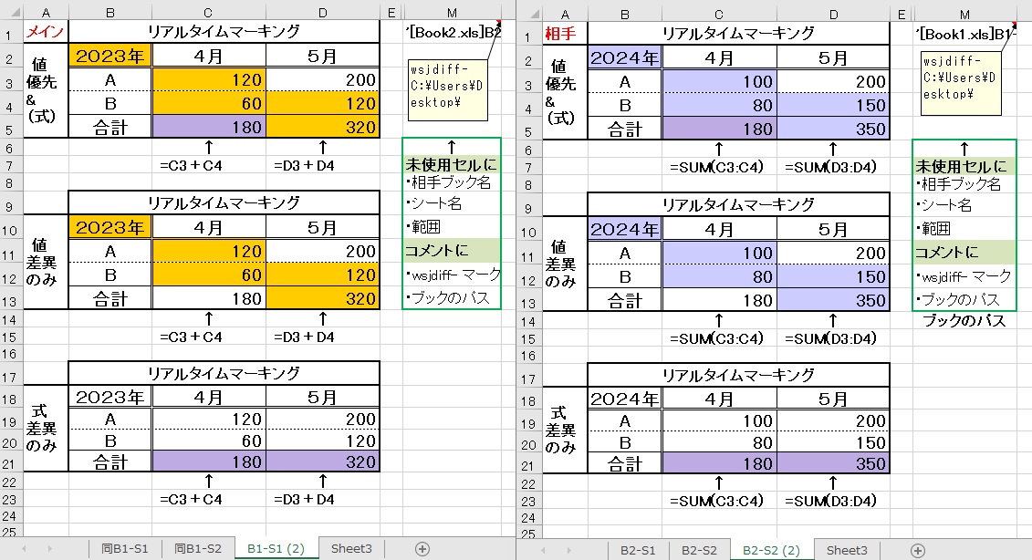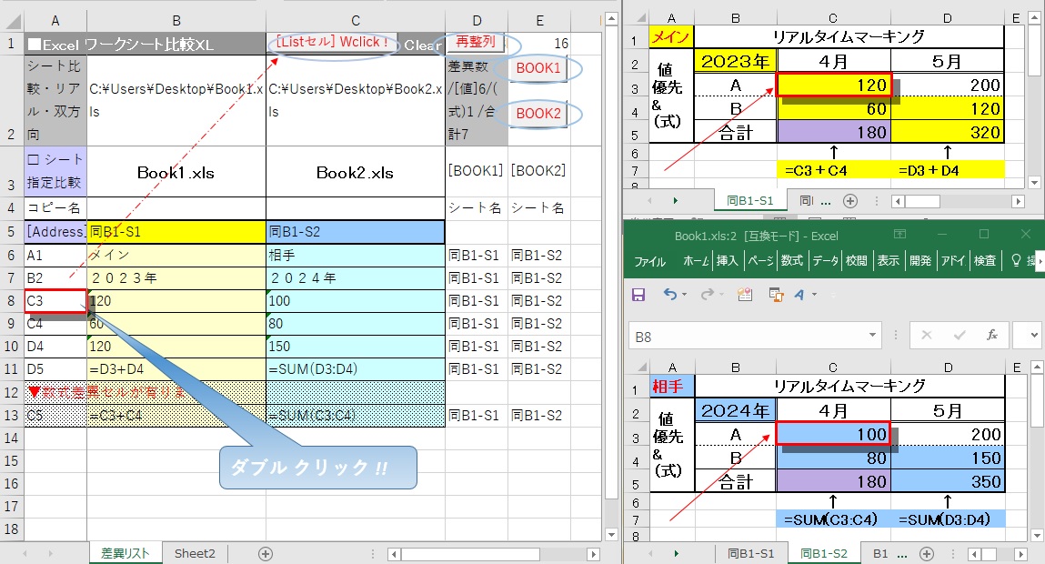 A:リアル比較の場合、対象のブックが開いている時は、リアル値(編集中の値)で比較します。